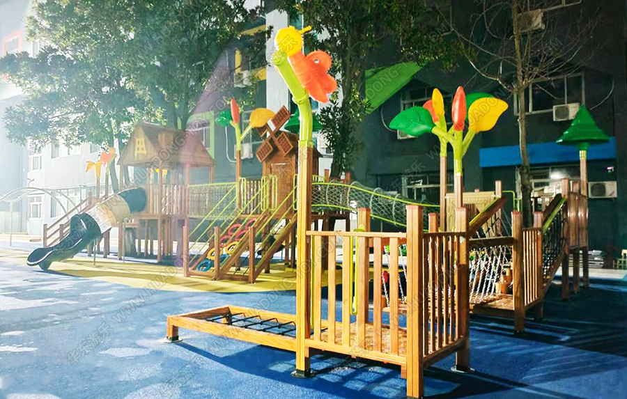 江苏省泰兴市育红幼儿园城西分校是经教育部批准的优秀幼儿园,该幼儿园此次采用的是乐鱼官网游乐生产的木制系列产品,具有爬网、攀爬、滑梯、脚踏水车、传声筒、钻洞等游乐设施。